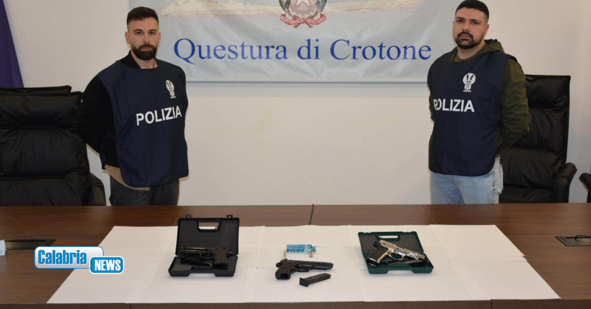 Prontamente gli agenti della Squadra Mobile collaborati da quelli della Squadra Volante, procedevano ad effettuare numerosi controlli nelle aree antistanti, mentre la Polizia Stradale avviava mirate ricerche lungo l’arteria della strada statale 106 che collega i paesi della Provincia con il capoluogo, procedendo a serrati controlli bloccando anche le arterie di ingresso e di uscita della città. Durante questi servizi una delle pattuglie della Squadra Mobile individuava un’autovettura con a bordo i giovani adottando ogni forma di tutela sia per gli operatori che per i cittadini che in quel momento erano presenti nella zona teatro dell’operazione. Nell’occasione gli agenti operanti sbarravano la strada e provvedevano a bloccare la marcia dell’autovettura mantenendo ben salde le emozioni riuscendo ad immobilizzare tutti gli occupanti e rinvenendo all’interno di un borsello nella disponibilità di uno dei passeggeri una pistola a salve munita di caricatore contenente 4 proiettili, nonché indosso ad altri due 4 proiettili inesplosi. Nel contempo unitamente agli agenti delle Volanti veniva estesa la perquisizione al veicolo dove nel cofano venivano rinvenute altre 2 pistole a salve di cui una con un caricatore contenente 4 proiettili e l’altra contenente 5 proiettili.