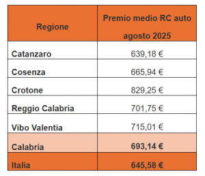 Il premio medio per assicurare un’auto in Calabria ad agosto 2025 è stato pari a 693,14 euro, in aumento, secondo l’Osservatorio RC auto Facile.it – Assicurazione.it, del 7% su base annua. Oltre ad essere una delle regioni in cui il premio medio costa di più, la Calabria ha registrato il secondo incremento annuale più alto d’Italia.