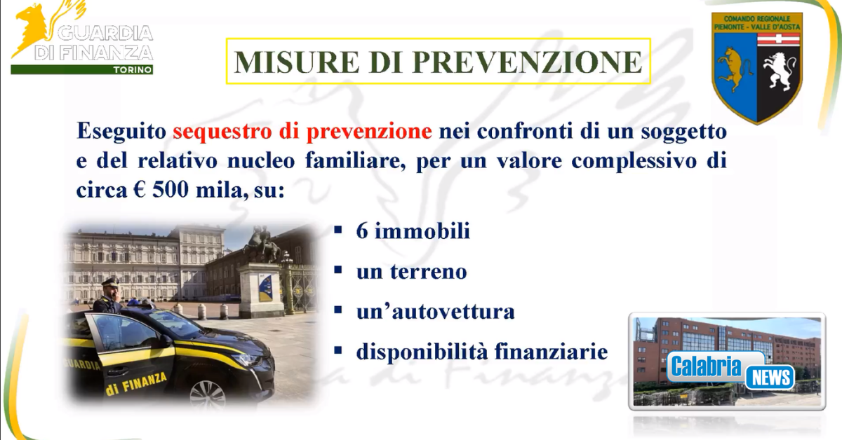 Su richiesta della Procura della Repubblica di Torino, la competente Sezione Misure di Prevenzione del Tribunale di Torino ha quindi da ultimo disposto il sequestro di prevenzione di disponibilità per circa mezzo milione di euro complessivi in capo al proposto e al proprio nucleo familiare, interamente eseguito dai militari del Nucleo di polizia economico-finanziaria Torino.